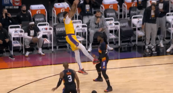 11分02秒,浓眉投篮时踢到克劳德的裆部,随后太阳悍将捂着裆部十分痛苦,痛苦倒地,回到场边依旧痛得拍打桌面,裁判多次回放这一幕,最终吹罚浓眉一级恶意犯规,克劳德也对浓眉犯规,浓眉执行两次罚球;浓眉如此恶犯引热议,现场球迷狂嘘浓眉。