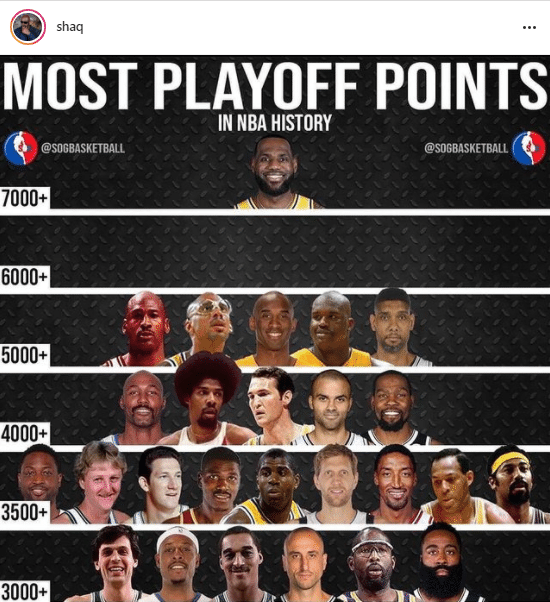 奥尼尔晒出NBA历史季后赛得分情况,只有詹姆斯一人季后赛得分突破7000+,强如乔丹、科比等传奇人物也只属于5000+这个层次。