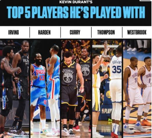 近日,关于杜兰特在采访中揭露的心目中TOP5队友名单的社交动态再一次引发了球迷的热议,我们先来看看杜兰特心目中这几年合作过,他认为最好的队友。