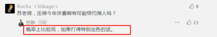 近日,名嘴苏群老师和球迷在网络上互动,谈到了庄神的去留问题。有球迷表示,“苏老师,庄神今年休赛期有可能续约湖人吗”,而苏群老师直接回应称,“概率上比较低,如果打得特别出色的话”。