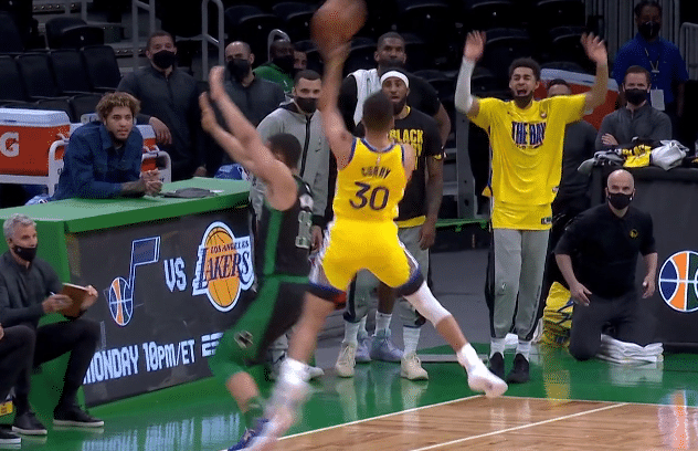 神仙球!库里踩着三分线超级勾手投进,绿军悍将上当后犯规