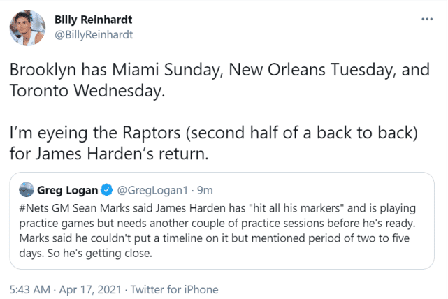 跟队记者Billy Reinhardt指出,篮网在打完黄蜂后,将连续面对热火、鹈鹕和猛龙,其中鹈鹕和猛龙是背靠背的比赛。他预计哈登将在对猛龙的比赛中回归,也就是背靠背的第二场。篮网主帅纳什在采访中表示,哈登会在泰勒-约翰逊之前回归,而约翰逊预计不需要再等2-3周,会在这个时间之前回来。