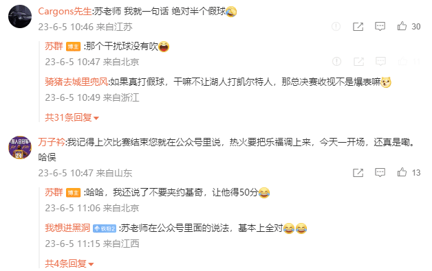 掘金领先15分,进入末节时领先8分还输球,确实很遗憾,比赛结束之后知名篮球人苏群除了盛赞热火和斯波教练之外,在和球迷的互动中还为掘金鸣冤,称末节的关键干扰球没有吹。