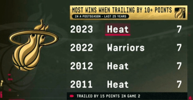 热火一度落后15分逆转,他们本赛季NBA季后赛第7次逆转10+,并列近25年最多;