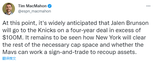 除了薪资空间之外,据体育画报记者Chris Mannis报道,为了追求布伦森,尼克斯还承诺让其担任球队的主力控卫;在达拉斯独行侠,布伦森和东契奇共同担任控卫,而在尼克斯,布伦森将掌控该位置。