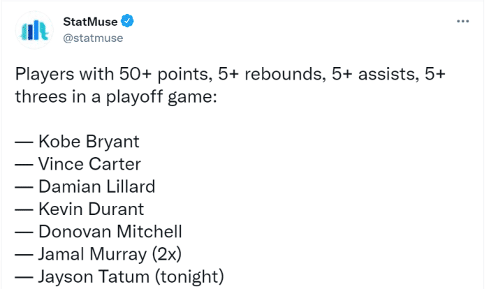第四,塔图姆是历史第7位在季后赛砍下至少50分5板5助攻5三分的球员,比肩科比、卡特、利拉德、杜兰特、米切尔、穆雷!