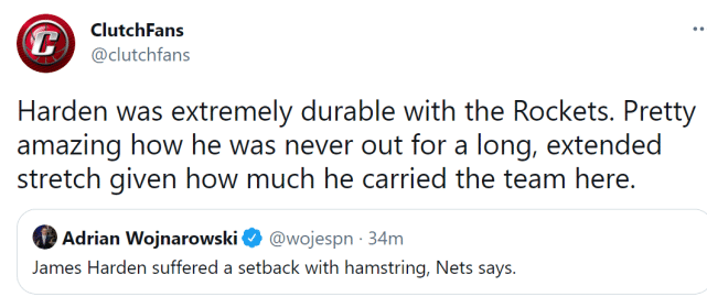 Billy Reinhart表示,谁能想到欧文会成为本赛季篮网最耐用的球星呢?这确实让人意料不到。火箭球迷社媒CLUTCHFANS写道:“哈登效力火箭时相当耐用,基本没有缺席这么长时间。他拼尽全力把球队带到那样的高度,还能不受伤病困扰确实不简单。”没想到刚去了篮网不到一个赛季,哈登就伤了,而且伤停这么久。不少球迷认为,纳什对于哈登的过度使用,是原因之一。