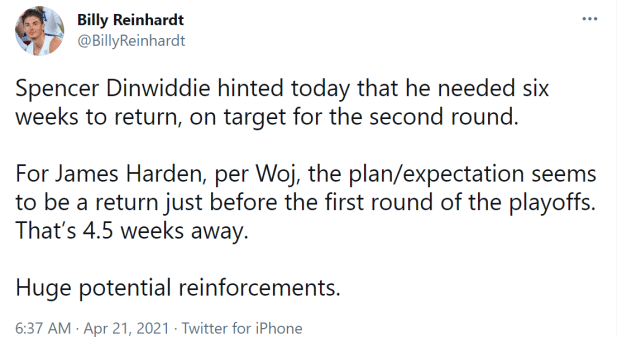 篮网曾被视为总冠军的大热门,但伤病无疑成为他们冲冠道路上的最大障碍。篮网跟队记者Billy Reinhart表示,根据沃纳罗斯基的报道,哈登要是能在季后赛首轮前回归,那大概是再休战4周半左右的时间。与此同时,丁威迪今天暗示自己需要6周左右的时间回归,那基本上就是在季后赛第二轮。