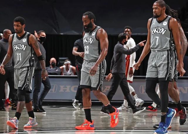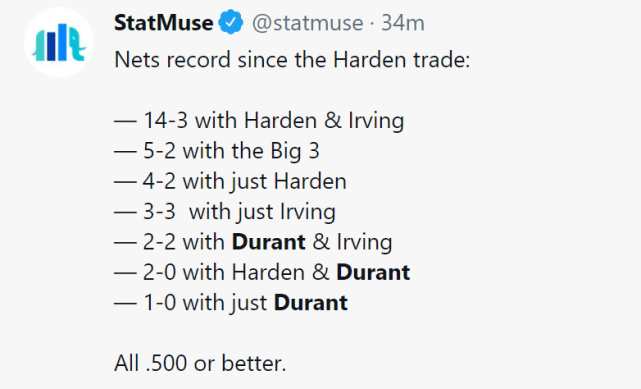 哈登欧文出战:14胜3负;三巨头同时出战:5胜2负;哈登单核出战:4胜2负;欧文单核出战:3胜3负;杜兰特欧文出战:2胜2负;哈登杜兰特出战:2胜0负;杜兰特单核出战:1胜0负。