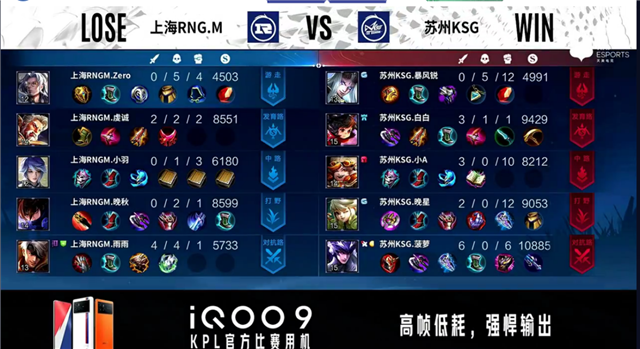 2分12秒,苏州KSG控下暴君。3分33秒,野区团,双方打出1换1,苏州KSG张飞拿下一血。4分32秒,苏州KSG控下先知主宰。4分45秒,野区团,苏州KSG击杀关羽。5分12秒,苏州KSG破掉上海RNG.M下一塔。5分35秒,上海RNG.M下路击杀橘右京,随后破掉苏州KSG下一塔。6分11秒,苏州KSG破掉上海RNG.M中一塔。7分54秒,上海RNG.M破掉苏州KSG上一塔。8分03秒,中路团,苏州KSG击杀关羽。9分21秒,苏州KSG破掉上海RNG.M上二塔。10分09秒,苏州KSG破掉上海RNG.M下二塔,随后团战打出1换2。11分10秒,苏州KSG拿下暗影主宰。11分35秒,上海RNG.M上路击杀狄仁杰。11分50秒,上路团,上海RNG.M打出1换4,随后苏州KSG橘右京拿下双杀。14分56秒,苏州KSG拿下暗影主宰。15分26秒,上海RNG.M控下暗影暴君。15分30秒,中路团,苏州KSG打出2换3,随后破掉高地塔点掉水晶连下三城终结比赛。