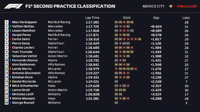 最终,在二练中维斯塔潘以1:17.301排名第一,博塔斯落后0.424秒排名第二,汉密尔顿落后0.509秒排名第三。佩雷兹和塞恩斯分列第四和第五,排名六至十位的车手分别是加斯利、勒克莱尔、角田裕毅、维特尔、阿隆索。