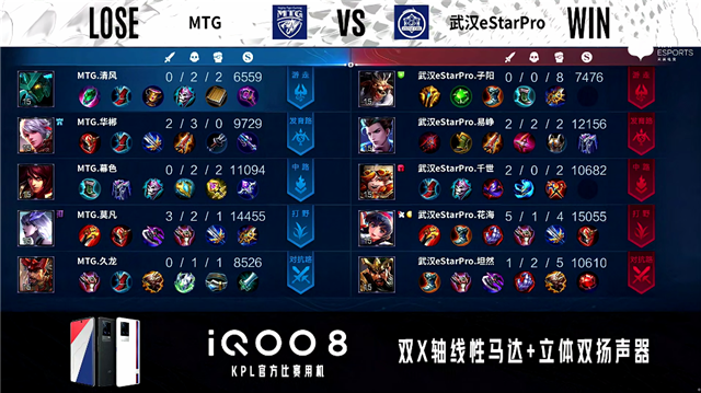 2分08秒,MTG控下暴君。2分29秒,MTG破掉武汉eStar下一塔。3分27秒,上路团,双方1换1。5分35秒,武汉eStar娜可露露上路击杀墨子。5分57秒,MTG镜下路击杀狄仁杰。6分30秒,MTG控下暴君。6分48秒,武汉eStar击杀周瑜。7分钟,武汉eStar控下先知主宰。8分18秒,MTG破掉武汉eStar中一塔。9分56秒,武汉eStar破掉MTG中一塔。10分14秒,武汉eStar控下暗影暴君。11分15秒,武汉eStar破掉MTG上二塔。12分10秒,武汉eStar拿下暗影主宰。12分48秒,MTG百里守约击杀关羽。14分26秒,武汉eStar上路击杀镜,随后破掉MTG上二塔。16分20秒,MTG控下暗影主宰。17分55秒,MTG破掉武汉eStar下二塔。18分23秒,武汉eStar团战打出1换5团灭对手。18分55秒,武汉eStar中路一波摧毁MTG水晶再下一城。