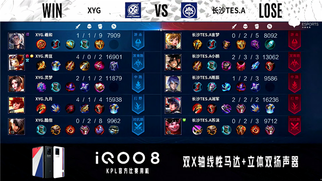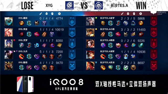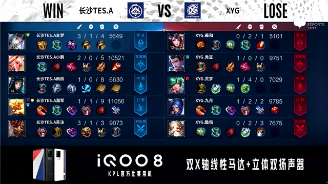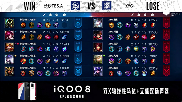 2分37秒,长沙TES.A关羽下路击杀李元芳拿下一血。3分27秒,XYG李元芳下路击杀太乙真人。4分15秒,长沙TES.A破掉XYG上一塔。4分44秒,长沙TES.A破掉XYG下一塔。4分55秒,双方1换1。7分37秒,长沙TES.A击杀东皇太一。9分06秒,长沙TES.A控下暴君。11分03秒,长沙TES.A控下暗影暴君。11分23秒,长沙TES.A破掉XYG中一塔。12分25秒,上路团,长沙TES.A打出0换2。12分55秒,长沙TES.A破掉XYG上二塔。14分25秒,长沙TES.A破掉XYG中二塔。14分50秒,长沙TES.A破掉XYG中高地。15分19秒,长沙TES.A控下暗影暴君。16分14秒,长沙TES.A破掉XYG上高地,双方团战1换1。17分27秒,长沙TES.A控下暗影主宰。18分14秒,长沙TES.A击杀李元芳。18分23秒,长沙TES.A破掉XYG下高地。18分53秒,长沙TES.A赢下团战后破掉XYG水晶拿到赛点。