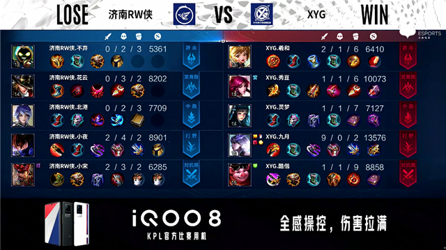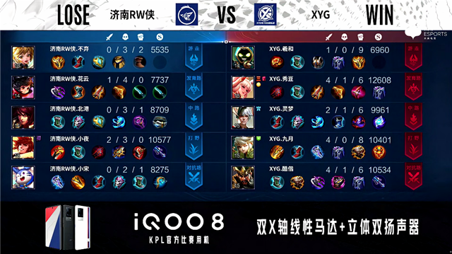 3分16秒,XYG控下暴君,随后济南RW侠控下先知主宰。4分44秒,双方团,XYG打出0换2。7分10秒,XYG击杀李元芳。7分30秒,济南RW侠拿下暴君,随后XYG拿下先知主宰。9分01秒,XYG嬴政破掉济南RW侠中一塔。9分30秒,XYG击杀裴擒虎。9分50秒,XYG破掉济南RW侠上二塔。10分40秒,XYG控下暗影暴君,随后济南RW侠控下暗影主宰。11分钟,双方团,XYG打出0换4。11分24秒,XYG破掉济南RW侠下高地及中二塔。11分50秒,双方团战1换1。12分45秒,XYG击杀裴擒虎。13分22秒,XYG破掉济南RW侠中高地。15分10秒,XYG团战打出1换3,公孙离拿下三杀。15分35秒,XYG团灭对手摧毁济南RW侠水晶拿到赛点。