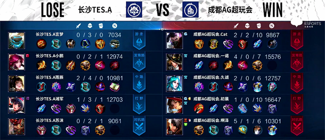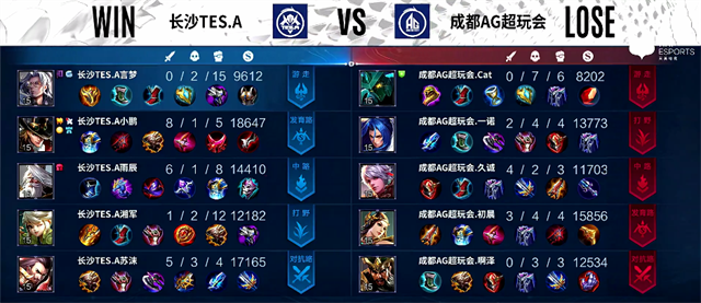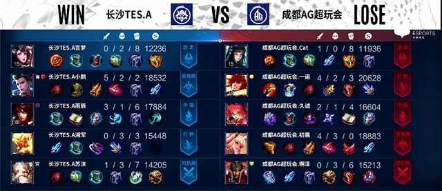 开局长沙TES.A入侵野区,澜拿下一血。1分36秒上路交火,梦奇被击杀。2分20秒澜拿下主宰。4分40秒夏侯惇被击杀,梦奇推掉上路一塔。4分50秒镜拿下暴君。6分30秒梦奇拿下主宰。8分34秒鲁班七号推掉下路二塔。9分17秒澜拿下暴君。10分20秒野区团战,成都AG超玩会打出0换2。11分钟鲁班七号推掉中路一塔。11分32秒澜拿下主宰。13分39秒鲁班七号推掉上路高地塔。15分钟成都AG超玩会推掉中路高地塔,团战团灭长沙TES.A。15分23秒成都AG超玩会推掉水晶拿下本场比赛胜利。