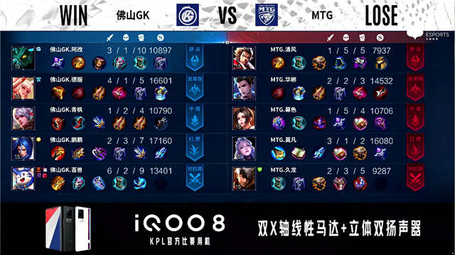 2分18秒,MTG控下先知主宰。3分52秒,佛山GK西施击杀老夫子拿下一血。4分33秒,佛山GK破掉MTG下一塔,随后露娜控下暴君。6分10秒,佛山GK击杀虞姬。7分10秒,双方1换1。8分04秒,佛山GK控下先知主宰。9分50秒,佛山GK破掉MTG中一塔。11分12秒,佛山GK控下暗影主宰,随后MTG控下暗影暴君,双方团战佛山GK打出0换2。14分10秒,佛山GK破掉MTG下二塔。15分16秒,河道团,MTG打出0换2,随后控下暗影主宰。15分44秒,MTG破掉佛山GK中路两座外塔及上、下路二塔。16分47秒,MTG拿下暗影暴君。17分10秒,佛山GK击杀貂蝉。18分50秒,MTG强拆掉佛山GK上高地。19分25秒,双方团,MTG打出1换4,虞姬拿下三杀。19分55秒,MTG中路一波摧毁佛山GK水晶赢下比赛。