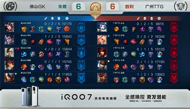 双方常规开局。1分08秒广州TTG拿下中路河道之灵。1分20秒佛山GK反掉敌方蓝BUFF。1分51秒佛山GK对抗路击杀东皇太一拿到一血。3分13秒佛山GK野区击杀露娜。3分59秒发育路团战佛山GK打出0换4。5分52秒佛山GK发育路击杀东皇太一。7分09秒双方中路1换1。7分25秒佛山GK拿下主宰。8分43秒佛山GK野区击杀东皇太一。8分58秒佛山GK摧毁敌方中路高地塔。9分23秒佛山GK拿下暴君。10分13秒广州TTG摧毁敌方对抗路二塔。10分27秒对抗路团战佛山GK打出1换3。10分59秒佛山GK拿下暗影主宰。11分54秒佛山GK发育路击杀东皇太一。12分04秒佛山GK摧毁敌方发育路高地塔。12分41秒佛山GK拿下暗影暴君。13分12秒对抗路团战佛山GK打出0换5。13分41秒佛山GK摧毁敌方水晶拿下比赛。