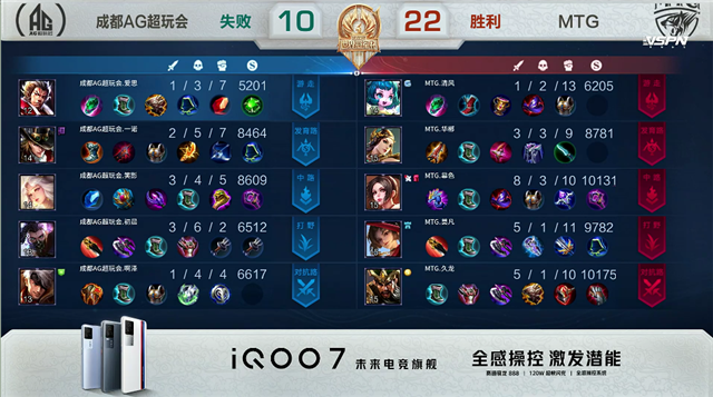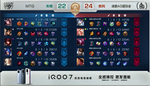 53秒,MTG不知火舞击杀嫦娥拿下一血。2分36秒,MTG拿下暴君。4分01秒,下路团,双方2换2,成都AG嫦娥拿下双杀。5分35秒,成都AG下路越塔打出0换3。7分22秒,MTG击杀兰陵王。7分35秒,下路团,MTG打出1换2。8分45秒,下路团,MTG打出0换4。9分01秒,MTG破掉成都AG下二塔。9分50秒,双方团战1换1。10分58秒,野区团,MTG打出2换3。12分24秒,MTG拿下暗影暴君,随后破掉成都AG中二塔。12分45秒,中路团,MTG打出1换4并破掉成都AG中高地。13分17秒,MTG团灭对手后破掉成都AG水晶赢下比赛。
