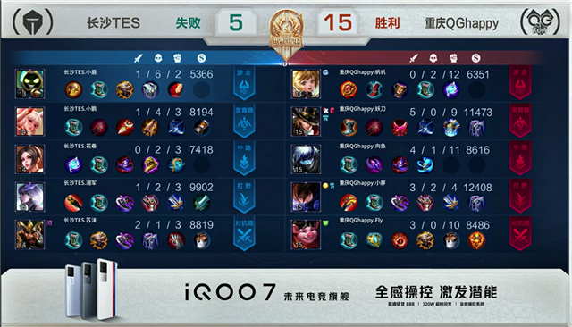 1分53秒,长沙TES花木兰上路击杀梦奇拿下一血。3分16秒,长沙TES拿下暴君。3分56秒,重庆QG强推掉长沙TES中一塔,长沙TES反打打出1换2。6分23秒,中路团,重庆QG打出1换2。7分43秒,长沙TES中路击杀虞姬。9分58秒,双方团,长沙TES打出1换3。10分33秒,长沙TES拿下暗影暴君。11分17秒,长沙TES上官婉儿击杀东皇太一。12分24秒,长沙TES拿下暗影主宰。13分42秒,长沙TES接连破掉重庆QG下、上二塔。14分11秒,长沙TES破掉重庆QG上高地,随后重庆QG击杀盾山。14分52秒,重庆QG拿下暗影暴君。15分18秒,双方团,长沙TES打出,2换3,伽罗拿下三杀。16分40秒,重庆QG拿下暗影主宰,随后团战双方4换4,虞姬拿下三杀。17分28秒,重庆QG虞姬接连破掉长沙TES中二塔及高地。18分35秒,中路团,长沙TES打出2换5团灭对手,花木兰拿下三杀。19分24秒,长沙TES破掉重庆QG水晶赢下比赛。