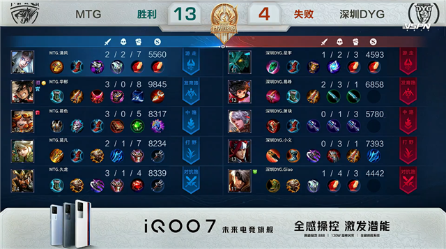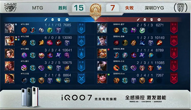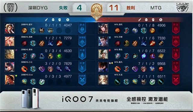 双方常规开局。1分06秒MTG拿下中路河道之灵。3分06秒MTG上路击杀吕布拿到一血,深圳DYG拿下暴君。3分34秒MTG拿下主宰。4分26秒MTG下路击杀公孙离。4分53秒双方上路2换2。5分48秒MTG摧毁敌方上路外塔。7分17秒深圳DYG野区击杀狄仁杰。7分34秒深圳DYG拿下暴君。7分48秒深圳DYG击杀大乔并摧毁敌方中路外塔。8分03秒MTG拿下主宰。9分39秒MTG摧毁敌方中路外塔。10分05秒野区团战MTG打出0换2。10分31秒MTG高地打出0换3。10分55秒MTG团灭深圳DYG摧毁水晶拿下比赛。
