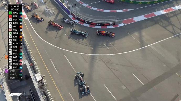 最后5圈,场上风云突变,维斯塔潘爆胎,被迫退出了比赛。佩雷兹处于领先,赛会立即出动安全车,随即出示红旗中断了比赛。比赛重启后,汉密尔顿轮胎锁死直接冲出了赛道,名次跌落到了队尾。