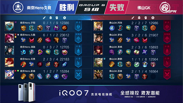 2分38秒, 佛山GK拿下暴君。3分21秒,南京Hero不知火舞中路击杀澜拿下一血。4分05秒,南京Hero不知火舞抓上越塔击杀廉颇。6分50秒,佛山GK澜河道击杀猪八戒。8分08秒,中路团,南京Hero打出1换5团灭对手。8分37秒,南京Hero破掉佛山GK中路两座外塔。9分48秒,南京Hero破掉佛山GK上二塔。10分22秒,南京Hero野区打出0换2,随后控下暗影暴君。10分46秒,南京Hero中路击杀李元芳。11分19秒, 南京Hero破掉佛山GK下高地。11分55秒,南京Hero击杀澜。12分55秒,南京Hero控下暗影主宰。13分42秒,南京Hero兰陵王击杀澜。14分08秒,南京Hero破掉佛山GK中高地。15分02秒,高地团,南京Hero后羿拿下三杀后推掉水晶先下一城。
