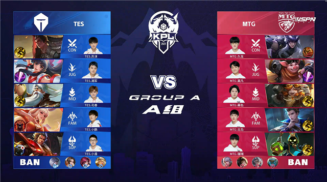 双方平稳开局。2分42秒双方中路1换1,TES拿到一血。3分06秒TES暴君处击杀兰陵王。4分47秒TES拿下暴君。6分04秒TES拿下主宰。8分03秒TES野区击杀鲁班大师。9分16秒TES野区击杀虞姬。9分30秒TES拿下暴君。10分05秒MTG下路击杀鲁班七号。10分58秒TES野区击杀鲁班大师。11分13秒TES拿下暗影暴君。11分45秒MTG野区击杀镜。12分54秒TES拿下暗影主宰。13分17秒MTG摧毁敌方中路外塔。15分42秒野区团战MTG击杀李元芳。16分03秒MTG摧毁敌方中路二塔。16分10秒MTG拿下暗影暴君。17分19秒TES上路击杀虞姬。17分54秒TES拿下暗影主宰。18分54秒TES主宰处击杀兰陵王。19分19秒TES摧毁敌方中路外塔。19分29秒中路团战MTG击杀太乙真人。20分02秒双方中路1换1。21分20秒龙王出团战TES打出2换4,MTG兰陵王拿到三连决胜。22分54秒TES拿下风暴龙王,中路团战TES打出0换2。23分28秒TES摧毁敌方水晶拿下比赛。