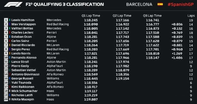 24直播网讯 北京时间5月8日晚,2021F1西班牙大奖赛排位赛在加泰罗尼亚赛道结束。经过1个多小时的争斗,梅奔车手汉密尔顿以1分16秒741的成绩夺得职业生涯第100个杆位,维斯塔潘落后0.036秒排名第二,博塔斯落后0.132秒排名第三。P4-P10分别为:勒克莱尔、奥康、塞恩斯、里卡多、佩雷兹、诺里斯和阿隆索。