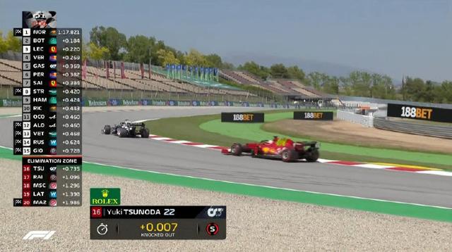 Q1开始后,红牛、梅奔和法拉利很快就包揽了前六名。博塔斯以1分18秒005在Q1过半时暂列第一,维斯塔潘、塞恩斯分列二三位,随后是汉密尔顿、勒克莱尔和佩雷兹。比赛中,拉提菲赛车的后视镜被赛道上飞溅起来的石子打碎,看着让人揪心。Q1结束时,诺里斯最后时刻做出1分17秒821,超越博塔斯升至第一,博塔斯和勒克莱尔分列第二和第三。拉塞尔压哨跑到第14位,挤进Q2。角田裕毅以0.007秒之差落后吉奥维纳兹,排名第16被淘汰,P17-P20分别为莱科宁、米克-舒马赫、拉提菲和马泽平。