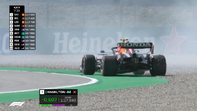 Q3开始后,博塔斯、汉密尔顿和维斯塔潘排队驶出维修区。佩雷兹在倒计时还剩不到7分半时冲出赛道,随后直接驶回维修区。第一个飞驰圈结束时,汉密尔顿以1分16秒741排名第一,维斯塔潘落后0.036秒位列第二,博塔斯落后0.132秒排名第三,只有佩雷兹暂无成绩。经过短暂休息,车手们再次上路后,除了勒克莱尔和佩雷兹之外,其他人都没能再将名次有所提高。