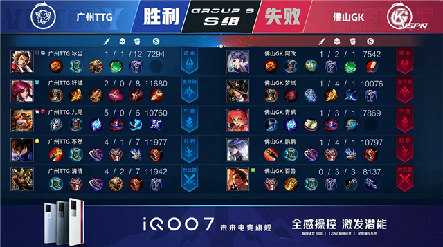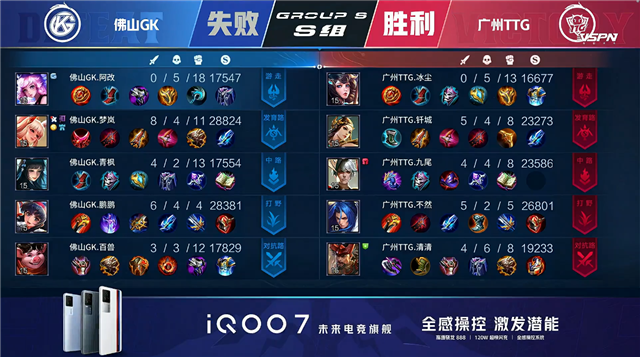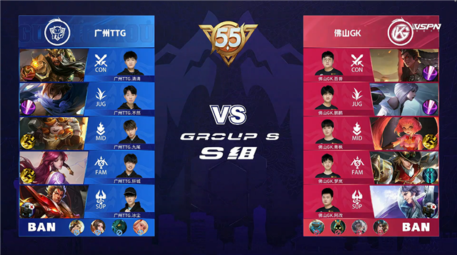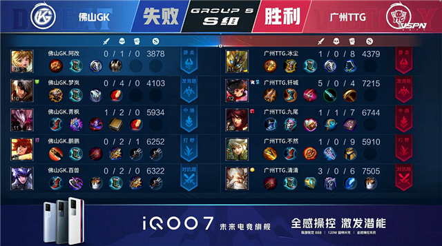 双方平稳开局,1分09秒佛山GK拿下中路河道之灵。1分58秒佛山GK下路击杀周瑜拿到一血。3分23秒广州TTG野区击杀马超。5分49秒下路团战广州TTG打出0换2。6分05秒广州TTG摧毁敌方下路二塔。6分40秒佛山GK拿下暴君。7分01秒野区团战广州TTG打出0换2。7分18秒广州TTG摧毁敌方中路外塔。8分26秒野区团战广州TTG打出0换2。9分40秒上路团战广州TTG打出0换4。10分17秒广州TTG摧毁敌方水晶拿下比赛。