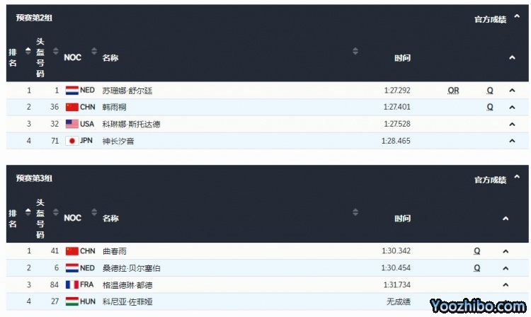 第二组比赛中,韩雨桐与名将舒尔廷同组出场亮相。比赛开始后舒尔廷一直处于领先位置,而韩雨桐一直紧紧跟在后边。最终韩雨桐以1:27.401位列小组第二成功晋级。而舒尔廷更是以1:30.342的成绩刷新奥运会纪录。