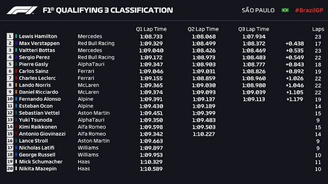 2021F1圣保罗大奖赛排位赛成绩表: