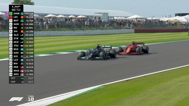 比赛最后10圈中,汉密尔顿连续刷新最快单圈,不断缩小与领跑的勒克莱尔之间的差距,最终,在第49圈,双方都遭遇慢车套圈后,距离来到了DRS区内。第50圈,汉密尔顿成功超越勒克莱尔升至第一,并最终一路领跑到底。另外,比赛最后阶段,第48圈,莱科宁与佩雷兹在第17号弯争抢中发生碰撞,前者赛车滑进缓冲区,引发短暂黄旗,不过好在赛车都未受损,赛会也表示要在赛后对二者进行调查。