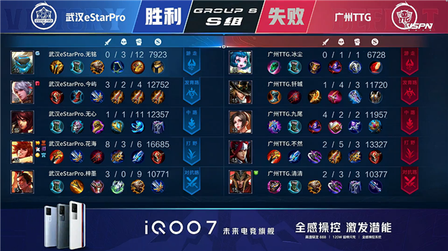 开局武汉ES不知火舞与夏侯惇换线。1分09秒武汉ES拿下中路河道之灵。2分29秒广州TTG抢到暴君。4分29秒武汉ES上路击杀关羽拿到一血。5分45秒广州TTG上路击杀不知火舞。6分29秒武汉ES下路打出0换2。7分16秒武汉ES摧毁敌方中路外塔。9分17秒中路团战武汉ES打出2换3。10分35秒广州TTG野区击杀马可波罗。12分32秒武汉ES拿下暗影主宰。12分42秒野区团战广州TTG击杀瑶。13分45秒中路团战武汉ES击杀太乙真人。14分47秒武汉ES拿下暗影暴君。16分18秒野区团战武汉ES打出1换2。16分40秒武汉ES摧毁敌方中路二塔。16分49秒武汉ES摧毁敌方下路高地塔。18分06秒上路团战广州TTG打出1换4。19分10秒广州TTG拿下暗影暴君。19分58秒上路团战双方1换1。20分46秒双方主宰处1换1。21分50秒野区团战双方2换2。23分44秒广州TTG野区击杀盘古。24分35秒广州TTG野区击杀夏侯惇。25分23秒广州TTG龙王处击杀不知火舞。25分35秒广州TTG拿下风暴龙王。25分54秒广州TTG摧毁敌方中路二塔。26分50秒广州TTG摧毁敌方上路高地塔。27分31秒野区团战广州TTG打出0换5。27分51秒广州TTG摧毁敌方水晶拿下比赛。