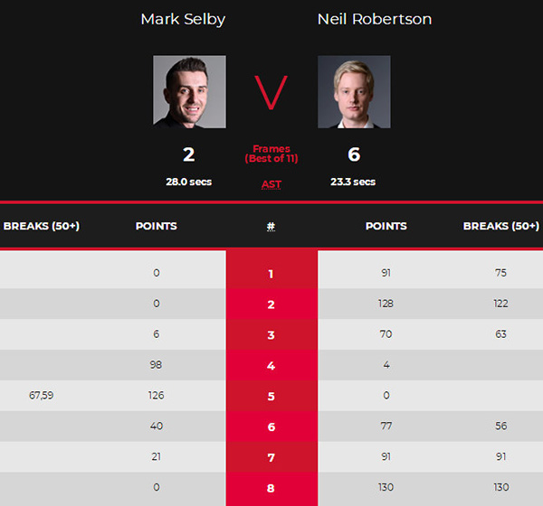 双方大战一触即发,上半场前三局,塞尔比毫无状态,首局罗伯逊上手一杆75分,以91-0零封先胜,第二局直接轰出破百高分,攻下122分以128-0连续两局零封。第三局塞尔比也只得到6分,罗伯逊单杆63分以70-6胜出3-0领先。第四局塞尔比才有所表现,几次上手以98-4追上一局进入中场休息。