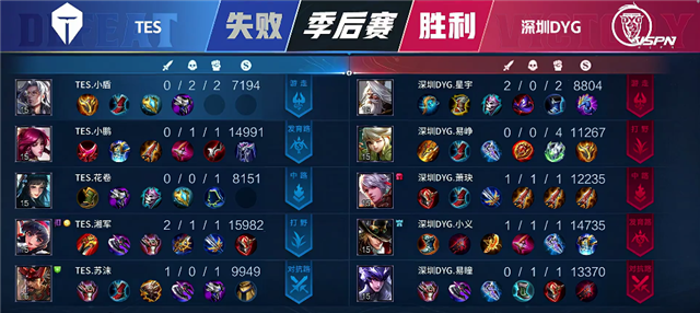 双方和平开局。2分20秒兰陵王拿下暴君。2分58秒干将莫邪拿下一血。4分55秒中路团战,西施被击杀,TES推掉中路一塔。6分20秒野区团战,TES打出1换2。7分10秒深圳DYG下路一塔被破。8分30秒野区团战,双方1换1。9分30秒关羽被击杀。9分50秒鲁班大师被击杀。10分41秒西施拿下主宰,蒙恬被击杀。10分50秒兰陵王拿下暴君。12分55秒TES上路一塔被破。14分10秒野区团战,TES打出0换2。14分50秒TES强攻上路高地塔,双方1换1。15分钟TES强推高地,TES团灭深圳DYG。15分29秒TES推掉水晶来到巅峰对决。