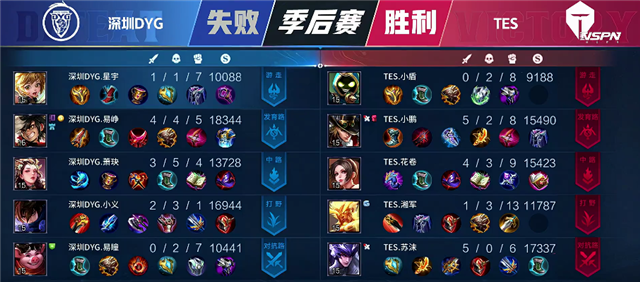 双方和平开局。1分钟中路团战,蒙恬拿下一血。2分35秒赵云拿下暴君。5分20秒深圳DYG推掉上路一塔。7分15秒赵云拿下暴君。8分40秒深圳DYG上路一塔被破。9分钟TES推掉下路一塔。9分30秒橘右京拿下主宰。13分钟赵云拿下暴君。14分13秒橘右京拿下主宰,周瑜被击杀。15分07秒深圳DYG推掉中路一塔。17分22秒赵云拿下暴君。18分30秒深圳DYG推掉上路高地塔。18分50秒深圳DYG推掉中路高地塔。19分20秒野区团战,双方1换1。20分钟野区团战,深圳DYG打出0换4。深圳DYG顺势一波直上高地,20分钟35秒深圳DYG推掉水晶率先来到赛点。
