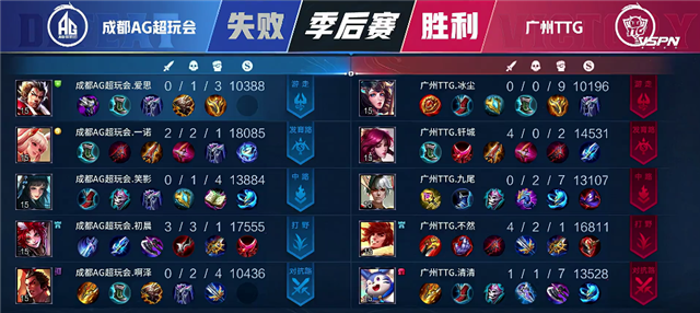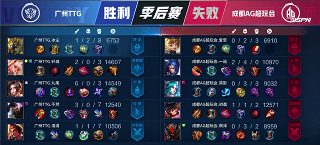 双方平稳开局。2分16秒百里玄策拿下暴君。5分18秒公孙离推掉下路一塔。5分25秒广州TTG推掉上路一塔。6分钟百里玄策拿下主宰。6分30秒广州TTG推掉下路一塔。6分35秒成都AG超玩会强攻中路一塔,公孙离拿下一血,成都AG超玩会推掉中路一塔。7分35秒百里玄策拿下暴君。9分28秒嬴政被击杀。10分钟成都AG超玩会推掉中路二塔。10分38秒百里玄策拿下暴君。11分25秒广州TTG推掉上路二塔。12分25秒百里玄策推掉上路二塔。12分40秒百里玄策拿下主宰。12分50秒百里玄策被击杀,成都AG超玩会推掉下路高地塔。14分55秒百里玄策拿下暴君。15分40秒成都AG超玩会强攻上路高地塔,团战成都AG超玩会打出1换2。17分钟野区团战,双方1换1。17分40秒成都AG超玩会拿下主宰。18分25秒公孙离推掉上路高地塔。19分25秒公孙离拿下暴君。19分40秒公孙离被击杀。20分24秒裴擒虎拿下风暴龙王。21分钟广州TTG推掉中路一塔。21分40秒广州TTG强攻上路高地塔,团战团灭成都AG超玩会,裴擒虎拿下双杀。21分56秒广州TTG点掉水晶再拿一分。