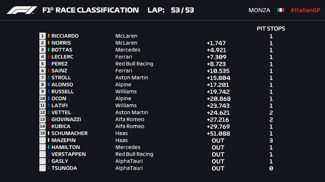 24直播网讯 北京时间09月12日晚,2021F1意大利大奖赛正赛在蒙扎赛道结束。迈凯伦车队包揽冠亚军,里卡多夺冠并创造了单圈最速,诺里斯亚军,这也是迈凯伦车队2010年加拿大站之后再次包揽冠亚军;梅赛德斯车队博塔斯从队尾发车最终超至第三名。法拉利车队勒克莱尔第四,加罚5秒的红牛车队佩雷兹第五,塞恩斯第六,斯托尔、阿隆索、拉塞尔、奥康分列七至十位。
