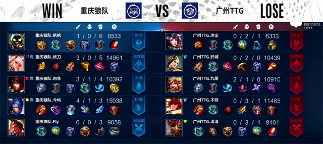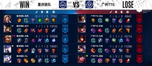 双方和平开局。1分钟下路交火,蒙犽拿下一血。2分15秒露娜拿下暴君。3分57秒露娜拿下主宰。4分50秒中路团战,双方1换1。5分15秒蒙犽推掉下路一塔。6分08秒李元芳推掉中路一塔。6分30秒阿古朵拿下暴君。6分55秒野区团战,广州TTG打出1换2。8分20秒露娜拿下主宰。8分40秒野区团战,双方1换1。10分20秒露娜拿下暴君。11分30秒露娜拿下主宰。13分20秒广州TTG推掉中路一塔。15分20秒露娜拿下暴君。16分45秒露娜拿下主宰。17分51秒蒙犽推掉下路高地塔。20分10秒中路团战,姜子牙被击杀。20分30秒中路团战,重庆狼队打出1换2。21分钟重庆狼队拿下风暴龙王。22分20秒露娜被击杀。23分14秒广州TTG上路和中路高地塔被破。28分20秒风暴龙王团,重庆狼队打出1换3。29分07秒重庆狼队推掉水晶拿下本场比赛。