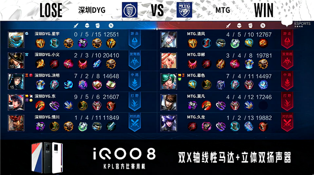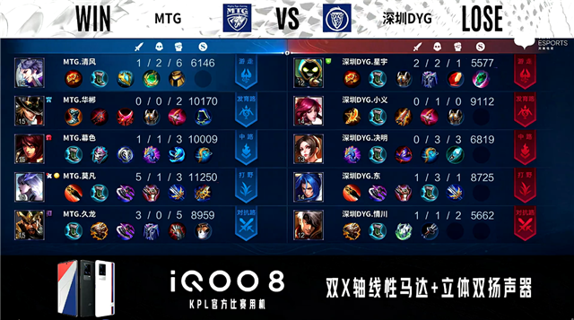 开局50秒深圳DYG对抗路击杀貂蝉拿到一血。2分13秒MTG拿下主宰,深圳DYG拿下暴君。2分50秒MTG野区击杀澜,深圳DYG主宰处击杀貂蝉。5分41秒深圳DYG发育路击杀孙膑。6分26秒深圳DYG野区击杀貂蝉并拿下暴君。7分整深圳DYG摧毁敌方发育路二塔。8分30秒MTG对抗路击杀刘邦。9分18秒野区团战深圳DYG打出1换4,澜拿到三连决胜。9分40秒深圳DYG团灭对手。9分45秒深圳DYG摧毁敌方水晶拿下比赛。