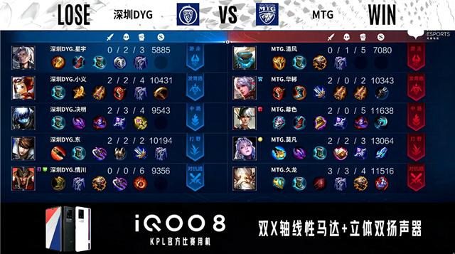 双方常规开局。2分10秒深圳DYG拿下主宰,MTG拿下暴君。3分30秒野区团战深圳DYG打出1换3,西施拿到三连决胜。4分57秒对抗路团战深圳DYG打出0换3。5分41秒深圳DYG野区打出0换2。5分59秒深圳DYG摧毁敌方对抗路二塔。7分36秒深圳DYG对抗路打出0换2。7分54秒深圳DYG摧毁敌方中路外塔。8分30秒深圳DYG抢到主宰。8分55秒深圳DYG摧毁敌方中路二塔。9分05秒深圳DYG摧毁敌方发育路二塔。10分21秒深圳DYG拿下暗影暴君。10分52秒深圳DYG拿下暗影主宰。12分31秒深圳DYG发育路击杀公孙离。12分59秒高地团战双方1换1,深圳DYG摧毁敌方中路、发育路高地塔。14分23秒中路团战MTG打出0换3。15分38秒MTG对抗路击杀娜可露露。17分56秒野区团战MTG打出0换2。20分20秒发育路团战MTG打出2换4,庄周拿到三连决胜。20分57秒MTG发育路击杀廉颇。21分39秒MTG拿下风暴龙王。24分12秒中路团战MTG打出3换4。26分30秒MTG拿下风暴龙王,深圳DYG打出1换2。28分37秒MTG摧毁敌方水晶拿下比赛。