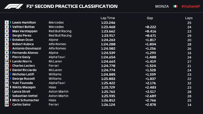 24直播网讯 北京时间9月11日晚,2021F1意大利大奖赛第二次自由练习赛在蒙扎赛道正式落下帷幕。二练中,汉密尔顿、博塔斯分列一二,维斯塔潘第三。