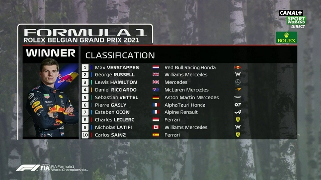 24直播网讯 北京时间08月29日,2021年F1比利时大奖赛正赛在斯帕赛道结束。原本21点开始的比赛因为受到大雨影响,一拖再拖直至0:17才在安全车的带领下跑了10分钟、2圈,因为赛道状况太差所以大会宣布终止比赛。最终红牛车队维斯塔潘夺冠,这也是他职业生涯第16个分站冠军;威廉姆斯车队拉塞尔亚军职业生涯首次登上领奖台,汉密尔顿季军并继续领跑车手积分榜。里卡多、维特尔、加斯利、奥康、勒克莱尔、拉蒂菲、塞恩斯分列四至十位。由于本场比赛并没有跑够足够的圈数,所以积分减半。