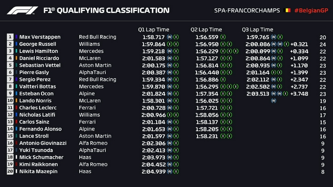 24直播网讯 北京时间08月28日,2021年F1比利时大奖赛排位赛在斯帕赛道结束,经过一场雨战,红牛车队维斯塔潘最后时刻超越了威廉姆斯车队拉塞尔夺得杆位,拉塞尔第二职业生涯首次头排发车。梅赛德斯车队汉密尔顿第三。里卡多、维特尔、加斯利、佩雷兹、博塔斯、奥康和诺里斯分列四至十位。