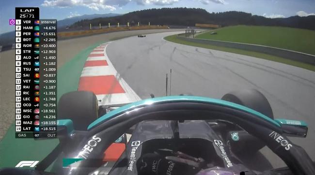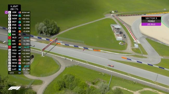 1圈跑完,赛道上前十名暂时为:维斯塔潘、汉密尔顿、诺里斯、佩雷兹、博塔斯、斯特罗尔、阿隆索、拉塞尔、里卡多和角田裕毅。第10圈,佩雷兹在3号弯超越诺里斯,升至第三,随后博塔斯也在同圈完成对诺里斯的超越,升至第四。第12圈,使用硬胎的莱科宁在发车后,已经上升了6个位置,来到第12位。
