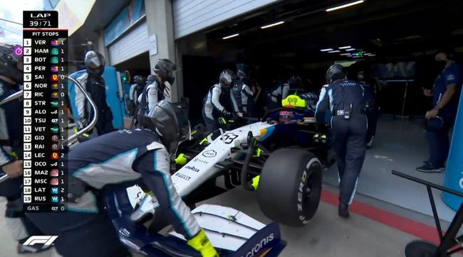 第30圈,维斯塔潘和汉密尔顿都完成进站,继续排在前两位。博塔斯以1分09秒071刷新最快圈速。拉塞尔第2次进站,技师帮其处理赛车部件问题,出站后落到倒数第二位。第39圈,勒克莱尔第2次进站,出来排名第14位。同圈,拉塞尔退赛。