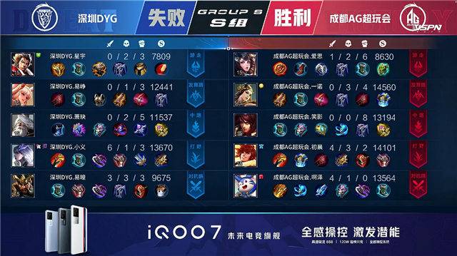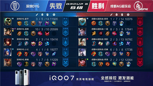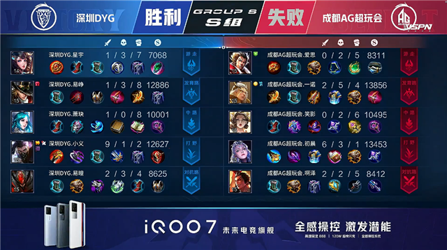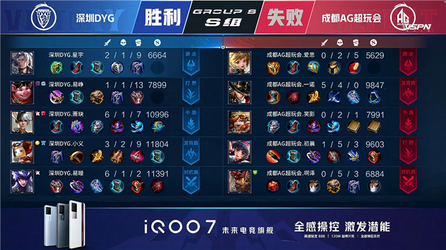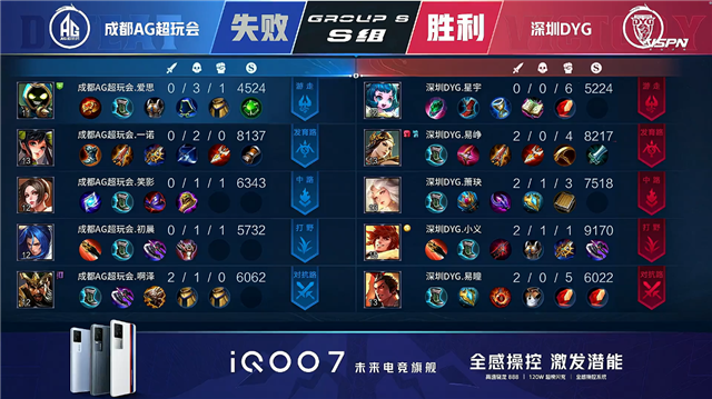 双方常规开局。2分29秒深圳DYG下路击杀后羿拿到一血。2分53秒深圳DYG主宰处击杀露娜。4分43秒成都AG野区击杀大乔。5分05秒双方下路1换1。6分28秒深圳DYG抢到暴君。6分44秒成都AG上路击杀白起。6分55秒野区团战深圳DYG打出0换3。7分18秒成都AG中路1换2。8分32秒成都AG下路打出0换2。8分41秒深圳DYG兰陵王野区单杀后羿。8分53秒成都AG摧毁敌方中路外塔。9分48秒中路团战双方打出1换1。11分15秒深圳DYG下路打出0换2。13分17秒成都AG拿下暗影主宰。14分35秒野区双方打野互换。15分39秒成都AG拿下暗影暴君。16分42秒深圳DYG摧毁敌方水晶拿下比赛。