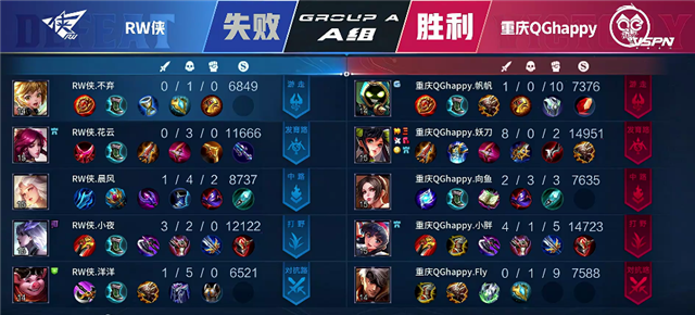 开局双方平稳开局。2分11秒橘右京拿下主宰。2分35秒盘古拿下暴君。3分22秒上河道团战,嫦娥拿下一血。5分41秒公孙离推掉下路一塔。6分26秒虞姬抢下主宰。6分48秒橘右京推掉上路一塔。7分34秒盘古拿下暴君。8分24秒双方互换边路一塔。9分30秒野区团战,大乔被击杀。10分10秒西施被击杀。10分44秒盘古拿下暴君。12分45秒重庆QGhappy强推中路一塔,西施被击杀。12分50秒虞姬推掉上路二塔。13分35秒盘古拿下主宰。14分17秒橘右京被击杀。14分40秒重庆QGhappy强攻上路二塔,西施被击杀。15分钟RW侠中路高地塔被破,团战RW侠打出1换2。15分50秒橘右京拿下暴君。16分钟RW侠推掉中路一塔。16分20秒上河道团战,重庆QGhappy打出0换3,公孙离拿下双杀。重庆QGhappy顺势上路一塔强推高地,团灭RW侠。17分13秒重庆QGhappy点掉水晶率先拿下一分。
